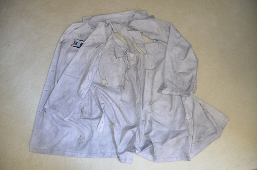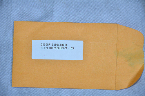 By following the appropriately named @ScaleSeeker on Twitter, a student at Midtown Science High School, those wishing to participate and those who just wanted to follow along, received the coordinates for a location where they would find evidence of the Lizard’s existence. Once the hunt began, those who found evidence were to tweet with the hashtag #LizardTrail. Uncovered evidence included Dr. Curt Connors’ ripped lab coat with ID, a slide with what appears to be shed scales. The scales reveal an OSCORP project called “Herpeton” and each slide is labeled with a sequence number. Thanks to @GuestUser17 for the photos of the evidence he collected!