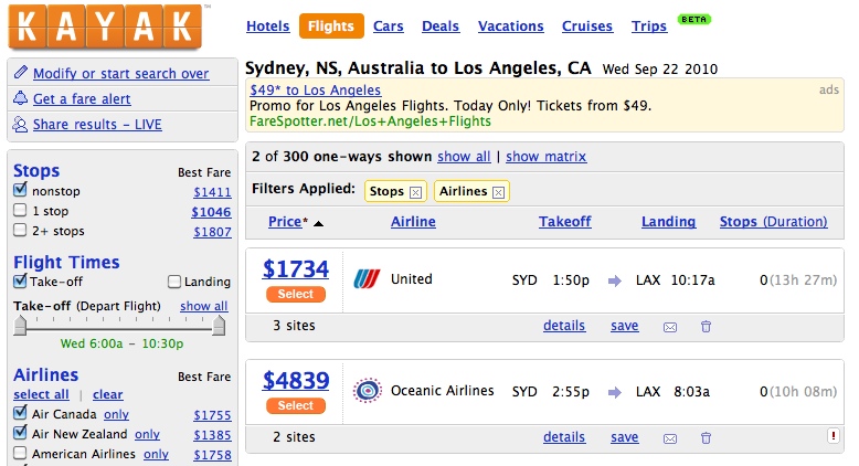 LOST: Book Oceanic Flights and Are There Too Many Questions To Answer? Corey, January 28, 2010January 28, 2010 ABC’S LOST will be airing its 6th and final season this Tuesday and in the light of that, the show is on a massive advertisement campaign. Being no stranger to viral campaigns , LOST even won an Emmy for Outstanding Creative Achievement in Interactive Media. The show has had websites like damoncarltonandapolarbear.com and didyouburyit.com adding to the overall experience and giving us probably some of the best fan-made art I’ve personally ever seen. Well, recently, we’ve been given more fan-created LOST content like the Real Time Oceanic 815 Crash, a travel site booking Oceanic 815 flights, and the parody song you can watch after the jump. The music video, a collaboration between popular YouTubers The Fine Brothers and Rhett & Link, asks what every LOST fan dreads: “Are there too many questions to be answered?” Check it out below. /Film today reported that Kayak.com, a popular travel website, made available to purchase tickets for a flight from Sydney, Australia all the way to Los Angeles, California on the fictional airliner Oceanic. Non-LOST fans or fans who need a reminder may wonder what that even means. Oceanic is the airliner that the LOST castaways crashed on the island in, Oceanic flight 815 to be exact, which is the same flight number on Kayak. This small fun easter egg (pic below) makes any LOST fan happy and even more excited for the season 6 premiere. LOST premieres its 6th and final season on February 2nd, 2010 at 7/8c on ABC. Viral Marketing 24ABCLOSTparodyRhett and LinkThe Fine BrothersYouTube