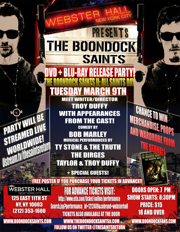 The Boondock Saints: LIVE! DVD Release Party Scott Caldwell, March 9, 2010March 9, 2010 As you know, we have spent some pretty decent coverage on both, The Boondock Saints, as well as it’s sequel, All Saints Day, for their concentration on it’s word of mouth in efforts to get both films wherever it can. It’s done such a terrific job, well, the FANS have done such a terrific job, that Troy Duffy and the cast have taken the show on the road. Because of the great turnout and the showing of support in LA, they’ve decided to take a road trip and let all enjoy. So, they created a killer tour bus, filled it with the cast, and hit the road. And, if you can’t make it to the party, they have you covered. In honor of the sequels release on Blu-ray and DVD, this party is global. Streaming live video by Ustream And, do not forget about the poster giveaway. Contest ends on the 11th, and that is just around the corner! Contests News Viral Marketing The Boondock Saints