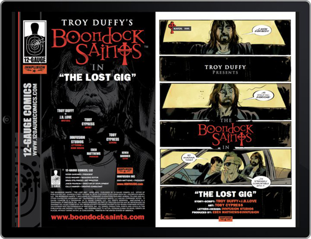 The Boondock Saints Media Blitz Scott Caldwell, April 23, 2010February 2, 2025 As we’ve covered in the past, The Boondock Saints films have been a success based on their fans, and in addition to that, having their fans spread the love and show their appreciation. And, time and time again, the fan is repaid. Whether it be a special screening, a special night, and hell, even a cast member serving you drinks, those involved with the film(s), take care in return. To read all about the Saints in comic, music, and digital form, read more! In celebration of the release, and incredible DVD sales of The Boondock Saints II: All Saints Day, the slew of Saints material is coming from every side, and not to be outdone of the success of the iPad and such apps as the Marvel app, they have quickly jumped to the newly found, environmentally friendly, iPad comic book. Not only do they have a comic book comic out written by writer/director Troy Duffy, but before it’s paper release later this month, it’s available NOW as an iPad download, with an exclusive interview with Troy himself. THE BOONDOCK SAINTS: “THE LOST GIG” is the title of the current comic, leading up to the release of THE BOONDOCK SAINTS: “IN NOMINE PATRIS”. It looks like the iPad and comic books are going to be a match made in heaven, and the Brothers McManus are going to lead them in prayer.And, while flipping through your digital pages, you can also check out the now available soundtrack to the sequel.Paperback, or digital iPad print? Will the comic book collectors be ok going green and hi-tech, or is there something about a collection that makes one proud? What do you think? News Boondock Saints II: All Saints DayiPadThe Boondock Saints