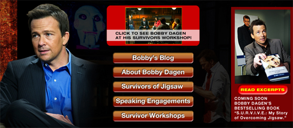 Can You S.U.R.V.I.V.E. Saw 3D’s Viral? Scott Caldwell, October 15, 2010October 15, 2010 Hello. Want to play a game? Well of course you do! That’s why you’re a fan of viral campaigns. And now, a film that is long overdue for one has finally jumped on board, just in time for their final film. This being Saw 3D, and it’s ever so popular series of films, will be closing its doors for good on October 29th. One of the survivors of Jigsaw’s traps is writing a book entitled S.U.R.V.I.V.E., and is touring the internet to tell us about it. Keep reading to find out more. Bobby Dagen (Sean Patrick Flanery) is a survivor of Jigsaw’s traps and now he wrote a book? But wait. Who is Bobby Dagen? We can either wait for the film to come out, or get to know this self help guru of the tortured through a few forms of networking.BobbyDagen.com lets you hear the back story of this survivor, and his need to help those just like him using his S.U.R.V.I.V.E. method:Start your life anew. Understand your problems. Redefine your priorities. Verify your self-worth through commitment. Ignore your detractors. Value your loved ones. Embrace every day as if it were your last.There’s even a blog for survivors to tell their stories, which gives us another look what may be shown in the film. I’m guessing Costas Mandylor is pissed that all of these people got out, and now he’s coming back to get them. Who really knows, but keeping checking the blog as we may be hearing more stories prior to the film. Also, check out the video where Bobby gets heckled*. You can also stay current with the Facebook pages for Bobby himself, as well as his program, and Twitter.And if that isn’t enough, you can even challenge your Facebook friends in game from the official Saw 3D page where you can win props from the film’s trailer.Bobby's book may be a best seller...... due to his demise?Saw 3D is in theaters October 29th. Tell us what you think about this being the final Saw film.*He said “feet” Viral Marketing Viral Videos SawSaw 3DSean Patrick Flanery