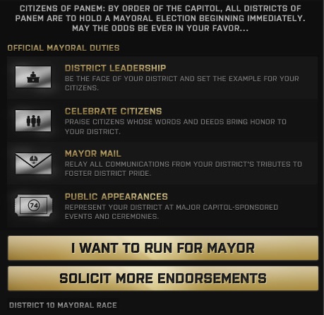 “The Hunger Games” Viral: Campaign for Mayor of Your District Michael Lee, December 7, 2011 When we last reported on the movie viral for The Hunger Games, they revealed district seals and before that they were basically accepting citizenship and district registration. Various districts had various trades, such as mining, farming, fishing, power, etc. So its not to late to become a citizen of Panem. And if you do, you will have a chance to declare that your candidacy for mayor of your district. To put your name up for election as easy as becoming a citizen of a district. Simply acquire your citizenship on Facebook and/or Twitter and then like the district you were assigned. You will then be given a link that will allow your friends to vote for you via twitter or e-mail. This will allow you to increase your chances to win the mayoral seat. So do you have what it takes to win? Can you speak for your district? Give praise to your districtmen? Be liason for your tributes to up your district’s pride? Then run for mayor of your district.We aren’t entirely sure what you win besides the title of mayor of your district, but becoming mayor allows an “average citizen’s chance to escape the drudgery of District life and shape Panem’s destiny.” So if you are really into ARG, you know what access to The Capitol grants you. ARGs & Campaigns Viral Marketing LionsgateThe Hunger Games