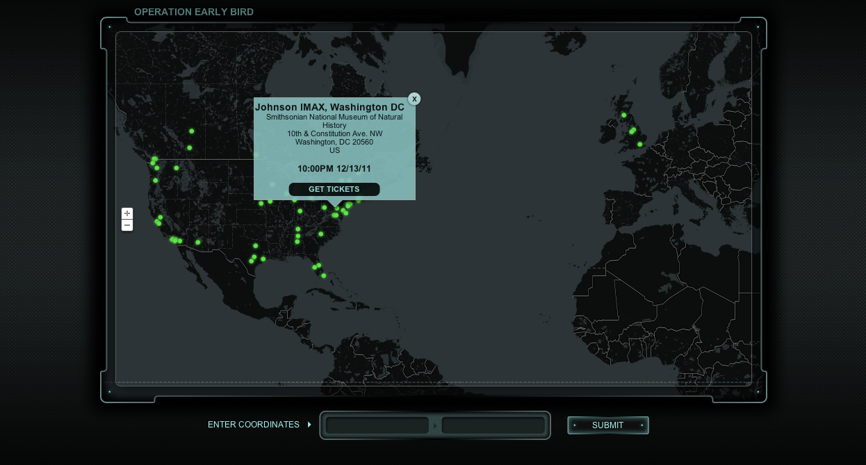 Operation Early Bird Leads to Early Screenings of “The Dark Knight Rises” Prologue Caleb Hamilton, December 9, 2011December 9, 2011 Earlier this week, two mysterious CIA documents were “leaked” online. It was quickly revealed that these had something to do with The Dark Knight Rises. A third document, tweeted out yesterday by The Fire Rises, mentioned a black ops mission called “Operation Early Bird”. This lead to the discovery of a website and a countdown, which ended today. So what exactly is Operation Early Bird? Hit the jump to find out.When the countdown clock hit zero, a blank map appeared at the Operation Early Bird website. Below the map you can enter coordinates. But there were no hints as to where to find the coordinates or what would happen when entered.Several people found that if you head over to the film’s official website, an audio clip plays which gives out coordinates to enter at the Operation Early Bird site. Once entered, a location on the map is covered with a little green dot. From there, you can go to Gofobo to reserve passes for an “early” (it’s at 10 PM) screening of the opening sequence of The Dark Knight Rises next Tuesday, December 13th. This event follows a press screening held last night at Universal Studios: Hollywood, where director Christopher Nolan introduced the sequence. Next week’s event also gives more people a chance to see the footage since it is only playing before Mission: Impossible-Ghost Protocol at 42 IMAX theaters across the U.S., Canada and the U.K.The Dark Knight Rises hits theaters and IMAX July 20th, 2012! ARGs & Campaigns Viral Marketing Operation Early BirdscreeningThe Dark Knight RisesWarner Bros