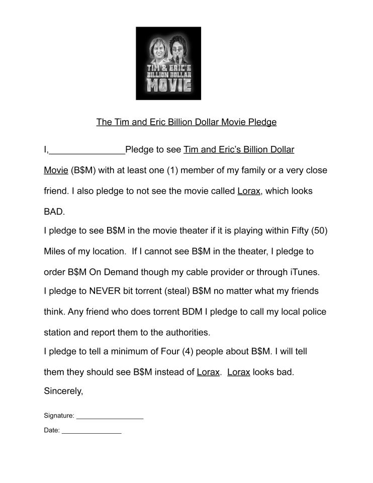 Now’s The Time To Sign The “Tim & Eric Billion Dollar Movie” Pledge Michael Lee, January 27, 2012January 27, 2012 Sundance is not only home to some of the best movies the world has to offer, its also the place where various movie studios bid to purchase the rights to distribute them. But since this is a site about viral marketing, we aren’t going to cover any purchases, and instead focus on the new viral activity that has been taking place during the festival.As some of you may know the Tim and Eric’s Billion Dollar Movie, the feature-length version of the duo’s popular Adult Swim series of the same name, will officially hit theaters on March 2nd, but goes on demand tomorrow. The duo behind Tim and Eric’s Billion Dollar Movie wants you to sign a pledge that states that you will see their movie and not Universal’s The Lorax. Hit the jump to see how you can get involved. As aforementioned, the two have created a pledge that says you (plus one member of your family) will see their movie instead of The Lorax on March 2nd. Here is the exact pledge that you will be signing. You can download the full pledge on the official Tim and Eric Facebook fan page here. Then upload a video of yourself signing the pledge on youtube.To get the pledge going, some of the biggest names in Hollywood, including Paul Rudd, Elijah Wood, Andy Samburg and Rashida Jones, have already signed the pledge, which should be some sort of incentive for you to do so as well. Below are just some of those videos of actors and actresses signing the pledge.Paul Rudd Elijah Wood Rashida Jones and Andy Samburg Tim and Eric themselves asking you to sign the pledge If you wanna sign, be sure to grab the pledge from Facebook and then post a video on YouTube. Viral Marketing Viral Videos Adult SwimSundanceTim and Eric's Billion Dollar MovieTim and Eric's Billion Dollar Movie Pledge