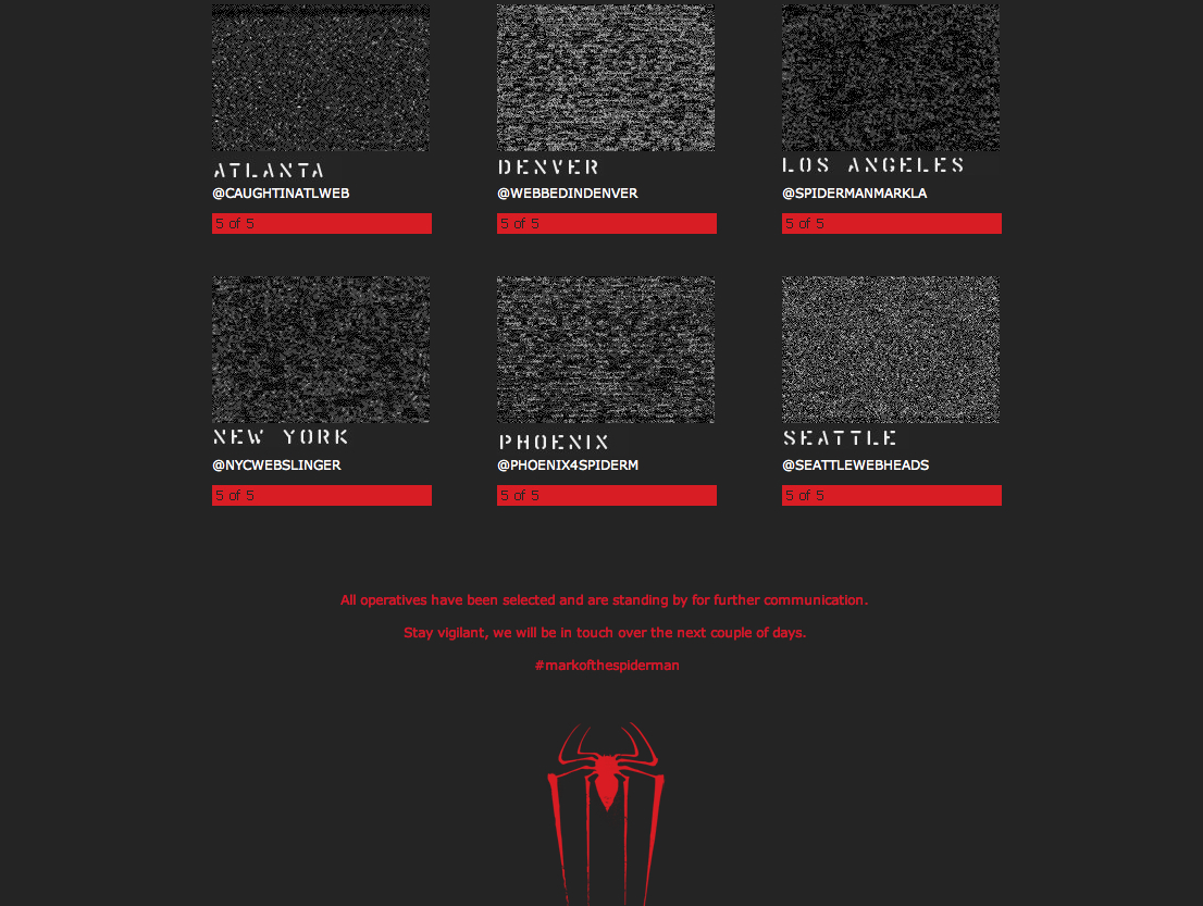 Mark of the Spider-Man Viral Updates Caleb Hamilton, February 14, 2012March 21, 2012 If you’ve been following along, a twitter account for the new The Amazing Spider-Man viral campaign, Mark of the Spider-Man, was created and sent out coordinates for several U.S. cities late last week. Following the coordinates, players found Peter Parker’s backpack full of different items, including running shoes and the clue that would lead them to a countdown. The countdown ended today and in 6 cities across the country, players were sent on a hunt. What they found may surprise you…or not. Find out more after the break!When the countdowns began to hit zero this morning, the Mark of the Spider-Man page was updated with this message:So, you’ve found us.If you support us, if you support Spider-Man, now is your time. Follow the Twitter accounts of our operatives in each of these cities. They’ll tell you where to go to uncover the next step. For this pursuit we ask that you please be over the age of 18. Be safe, and good luck. We’re counting on you.Several Twitter accounts appeared, one for each city. New York was up first this morning, and clues were quickly sent out via @NYCWebSlinger. The players were all supposed to meet a representative at unspecified locations and give a password. They were then given instructions to go to another location to receive their assignment and in each city there were 5 assignments. After the first assignment was completed in every city, a second password and assignment were activated and this continued until all 5 were done.Players received packages containing “For Your Eyes Only” instructions, a cellphone and two black sweatshirts with a red Spider-Man symbol on the front. Thanks to a pic posted by @Slashfilm, we got a glimpse at the top-secret instructions given and the other items in the packages:Keep this cell phone fully charged and within reach at all times. We’ll be contacting you with further instructions.In the meantime, find a friend you can trust. We need you both, remember, you must be 18 or older.And keep a handle on the hoodies, you’ll be needing them. Every hero needs a neighbourhood. We are the neighborhood. Show your support.Once all 30 packages were claimed, the main Mark of the Spider-Man site was updated again with the following message:All operatives have been selected and are standing by for further communication. Stay vigilant, we will be in touch over the next couple of days.Thanks to Anton Volkov and his Tumblr page dedicated to this viral, we have learned that at least one player in Atlanta, has received a call from the Mark of the Spider-Man team, telling him to “be prepared” because something is happening tomorrow night.It is unknown at this time whether other “Spider-Operatives” got a similar phone call, but we’ll continue to keep you updated on this very exciting viral experience. Personally, it reminds me of the Citizens for Batman campaign from the massive viral for The Dark Knight.The Amazing Spider-Man 3D swings into theaters and IMAX July 3rd! ARGs & Campaigns Social Networks Viral Marketing Columbia PicturesMark of the Spider-ManThe Amazing Spider-ManTwitter