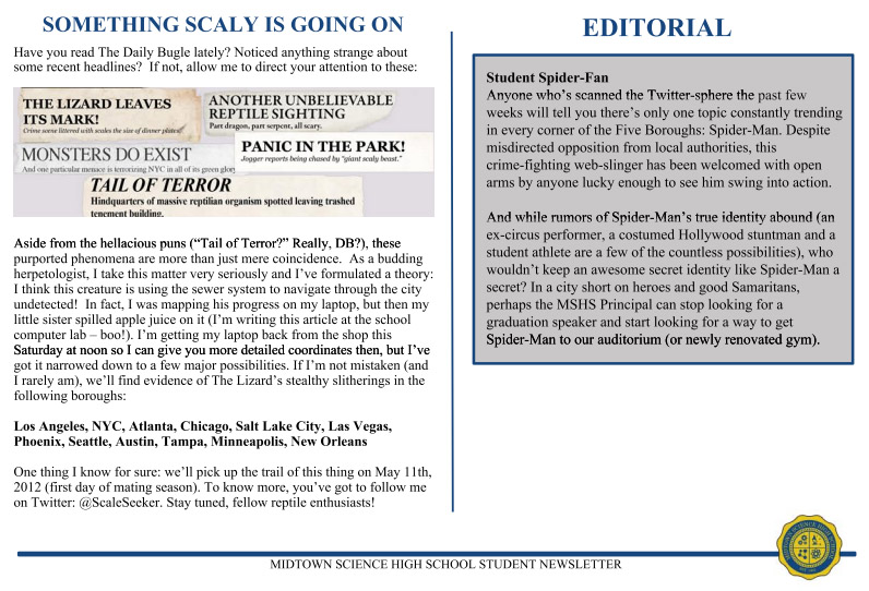 ParkerPOV Viral Reveals Parker’s Schedule and the Hunt for The Lizard Michael Lee, May 7, 2012May 10, 2012 The Amazing Spider-Man is turning out to be the viral that we here at MovieViral have been waiting for. Like The Dark Knight viral that ran a few years back, fans of the franchise and viral enthusiasts are looking forward to the next great update for the highly anticipated movie. But this isn’t the Manhattan Police asking for your help in looking for and apprehending Spider-Man. It’s Spider-man asking you for help to find the Lizard. Hit the jump to find out how you can find The Lizard and some more goodies.A new image was posted at ParkersPOV.com over the weekend. You might have caught the mathematical formula that appeared in the new image. But you don’t need a degree in Mathematics to figure this one out. Just use the simple alpha-numeric key (A=1, B=2, C=3 etc.) to decipher the code.But if you don’t want to do that now, the series of letters are the words “PPARKER” and “DEEPFOCUS”. So using PPARKER as the login and DEEPFOCUS as the password on the the newly launched Midtown Science High School website, you can get your geek stalking on because the Peter Parker’s schedule will be revealed to you. But if you want to actively participate in a viral, then this next bit is just for you. The MSHS is a vital piece of The Amazing Spider-Man viral campaign puzzle. A newsletter section on the high school website suggests that visitors follow the @scaleseeker on Twitter. @scaleseeker seems to be the high school conspiracy theorist of Midtown Science High school and on Friday at noon will reveal the details about the hunt for the Lizard in 12 cities: Los Angeles, NYC, Atlanta, Chicago, Salt Lake City, Las Vegas, Phoenix, Austin, Tampa, Minneaplis or New Orleans.Obviously there will be much more information about this event leading up to Friday, since there is a limited amount of information on the @scaleseeker’s twitter feed. But I wonder if this viral event will be along the lines of The Mark of the Spider-Man viral that ran a few months back.Be sure to keep up with MovieViral.com for updates as they become available! Don’t forget to take a look back at our archive for the The Amazing Spider-Man viral campaign for any news bits that you might have missed. ARGs & Campaigns News Viral Marketing Viral News Mark of the Spider-ManScaleseekerThe Amazing Spider-Man