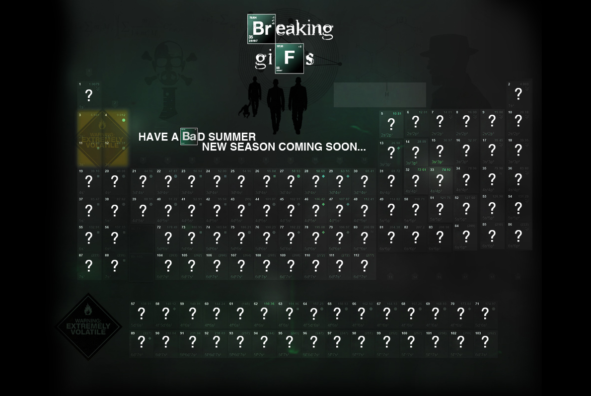 Viral Campaign For Final Season of “Breaking Bad” Begins Caleb Hamilton, May 9, 2012May 9, 2012 In 2009, comedian Paul Scheer created a site called Damon, Carlton and a Polar Bear, where he would post artwork based on the show LOST. It started out as a joke but it eventually grew into a huge phenomenon and soon exclusive pieces of art by Olly Moss, Tyler Stout, Eric Tan and more started to show up. A few months ago, Paul started BreakingGifs, a site dedicated to AMC’s hit, Breaking Bad, where Paul would post gif files related to the show. The site’s format changed and is now the start of a viral campaign promoting the upcoming final season of Breaking Bad. Find out more after the jump.BreakingGifs.com is now curated and run by Tyson Givens and Gallery 1988 and each week, the site will feature a new piece of Breaking Bad themed artwork by well-known and up and coming artists. This all started a couple of weeks ago when Paul Scheer posted a video (below), teasing something big that will happen on May 10th. The video also features a cameo by Breaking Bad creator Vince Gillian.Recently, the site changed to look like the Periodic Table of Elements. The first four question marks unveil a tweet that mentions an event happening at Irving Plaza in New York City, tonight at 9 PM EST.This event will likely lead attendees to the first piece of art. But fear not if you can’t make it, there will be more chances to get an art piece, and not every clue will be a physical location. A lot of them will be online. So all you have to do is keep an eye on BreakingGifs and follow them on Twitter, @BreakingGifs to play along.The final season of Breaking Bad will premiere this summer on AMC! Source: /Film Viral Marketing AMCBreaking BadViral marketing