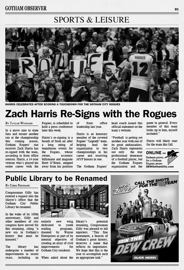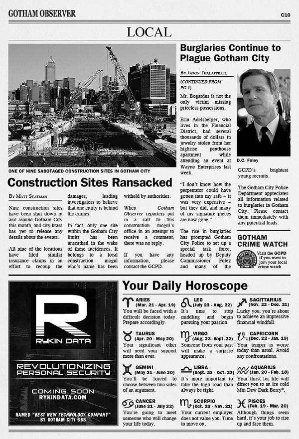 ‘The Dark Knight Rises’ Viral Campaign: Gotham Observer And New Tech Company Michael Lee, June 22, 2012June 22, 2012 Though the viral campaign for The Dark Knight Rises may not be as elaborate or exciting as its predecessor, but it’s still a great tool to use to drive interest for the film. Now with the film just a little over a month away from release, the viral campaign is intensifying. New issues of the Gotham Observer have been hitting the web, and they putting some of the newer characters front and center. Check it out after the jump.As you can see in the images below, Pepsi is sponsoring this portion of the viral campaign for The Dark Knight Rises. Other than that, it features some of the same basic concepts that was seen in The Dark Knight viral that ran a few years back.While there are numerous stories that run through this edition, there are only a few that you have to pay close attention too. The frontpage news is one that you should really be focusing on. The Harvey Dent story is following up on the events of the previous film, and there was an image of him being shown by Bane in promotional photos, so his name could come up again. We also have a story about a string of burglaries, this could possibly relate to Catwoman.If you flip past a few pages you will see an ad company for Rykin Data. Now to my knowledge, the company isn’t a part of Batman canon, but if you hit a link you will see that the site is under construction. There is also a patent that allows to wipe out your digital footprint. Again this could be linked to Catwoman.Other than that, the stories don’t have any significance. We will keep you updated on any developing news concerning the Gotham Observer and Rykin Data should they appear. The Dark Knight Rises opens on July 20th. Thanks to @VEGASRYAN for the heads up on Rykin. ARGs & Campaigns News Viral Marketing Viral News The Dark Knight Rises