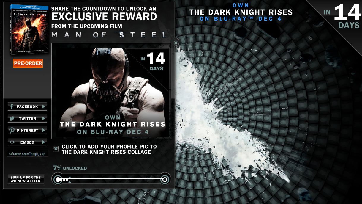 Countdown to “The Dark Knight Rises” Blu-ray Release to Unlock “Man of Steel” Content Caleb Hamilton, November 20, 2012November 20, 2012 We haven’t seen much from Zack Snyder’s Man of Steel since July, when trailers were released with The Dark Knight Rises. Warner Bros. will attach another trailer with The Hobbit: An Unexpected Journey next month, but they’re giving you a chance to get a look at some exclusive content early! More after the jump.The countdown to the home release of The Dark Knight Rises on Blu-ray early next month has begun. In a similar move by Marvel last month to unlock the Iron Man 3 trailer, Warner Bros. is asking fans to share the news of the TDKR Blu-ray release with their friends on Facebook, Twitter and Pinterest. Just visit the countdown site and click the ‘Share’ button.Once the meter hits 100%, a reward will be reveal an exclusive look at Man of Steel!Superman returns in Man of Steel on June 14th, 2013 in 3D and IMAX 3D! Social Networks Viral Marketing Viral News Man of SteelThe Dark Knight RisesWarner Bros