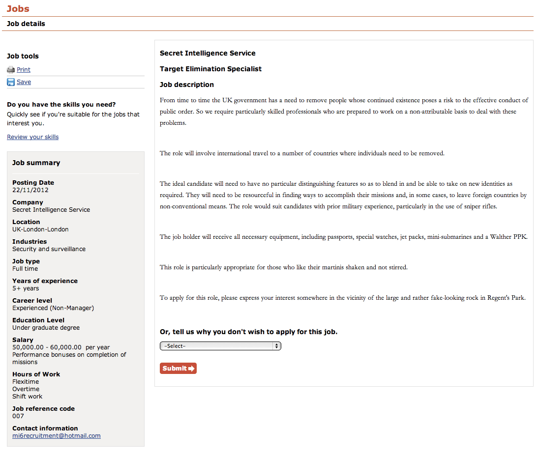Dream Job Alert: UK Government Posts, Removes Fake 007 Job Opening Alex Gerage, November 27, 2012November 27, 2012 Good work can be difficult to come by, especially in a tough economy, but for a brief time last week, your dream job may have been a simple application away. The UK government’s very official jobs database posted a very unofficial opening for a “Target Elimination Specialist,” with a position description reminding many of a familiar 007. Hit the jump to see if you’d qualify.The “Target Elimination Specialist” opening within the British Secret Intelligence Service was posted to Gov.UK last Thursday, and amazingly, wasn’t taken down for over 24-hours. During that time, job seekers visiting the site learned the position largely centers on “removing” individuals from all corners of the globe in the name of “public order.” While the desired qualifications includes the expert use of sniper rifles, the benefits are solid, with performance bonuses offered upon the completion of missions, and the promise to be outfitted with all “necessary equipment” for each job. Sarcasm aside, the British government really loves Bond (remember his Olympic Opening Ceremony skit with Queen Elizabeth?), but I doubt the government would demean its own standing by making this fictitious post intentionally. Whoever is responsible is likely a very clever hacker or a government employee with computer skills that doesn’t care much for their future (think a disgruntled Q). Fortunately, The Verge grabbed a screenshot of the job posting, which you can click to see in full below. Viral News Gov.UKJames BondOlympicsSkyfall