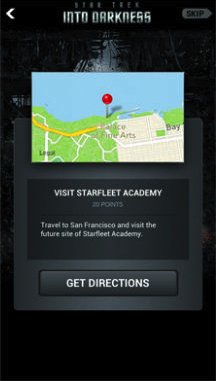 Featured App: A Viral Campaign Contained in “Star Trek Into Darkness” App Caleb Hamilton, February 3, 2013February 2, 2013 Paramount Digital Entertainment released its Star Trek Into Darkness mobile app this week on the Apple App Store and Google Play Store. Using new technology created by Qualcomm Labs, Inc., users will be able to unlock content from the film by participating in scavenger hunts and other real-world missions which will be unlocked as the film’s release date draws closer. After the jump, we’ll give you a look inside the app’s current features.Right now, there isn’t much to do with the app. When you first download it and sign up, there are several missions that one can complete in a matter of 5 minutes. A lot of the missions ask for stills to be scanned and then a “reward” (the image you just scanned) is unlocked. Completing each mission gives you points and move you up the ranks in Starfleet. Two missions require users to watch the announcement teaser as well as the teaser trailer.There is one location-based mission, visiting the future home of Starfleet in San Francisco, which will be quite challenging to complete if you don’t live in the area. Though I have read on forums and other sites that some users are able to trick the app into thinking they are in San Francisco.You can also enter a contest to win tickets to the U.S. premiere of Star Trek Into Darkness. Expect more missions to become available tonight as Super Bowl XLVII gets under way. Also be on the look out for the The first app exclusive surprise to be unveiled during the second quarter.Many people were wondering about is this app’s connection with the AreYouThe1701? website. So far, there isn’t, but the app itself is a self-contained viral campaign. The app’s contents will grow as you complete missions as a member of Starfleet. Content will also be released as May 17th gets closer. Collider reports that this app will also be used to release news and exclusive content for future installments in the Star Trek franchise.Overall, the app is very user-friendly and easy to navigate. It has a great News section where you can read all of the latest information about Star Trek Into Darkness. Exclusive goodies will be released down the line such as backgrounds for your phone and clips from the film. One thing I’d like to see improved is the difficulty of the missions. They’re just too easy right now, especially the photo scanning missions where you just do a Google Image search. The Star Trek App is now available on Apple’s App Store and Google’s Play Store! Apps Reviews Social Networks Viral Marketing Viral News AppParamount Digital EntertainmentParamount PicturesStar Trek Into Darkness