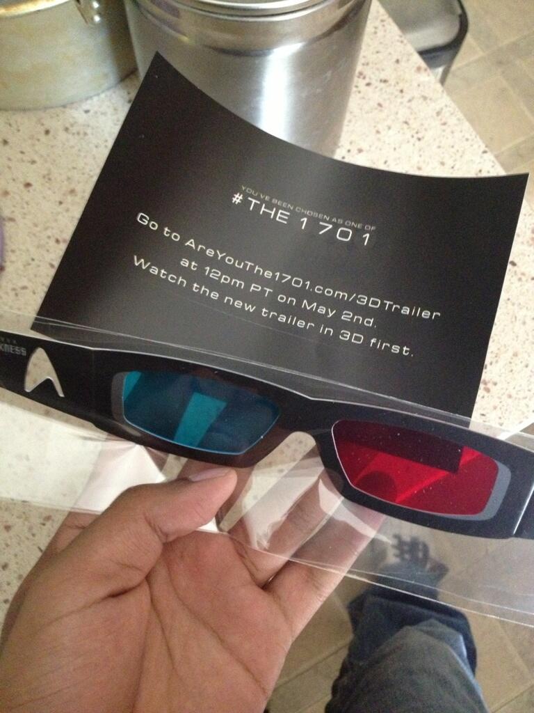 The 1701 Have Been Chosen in “Star Trek Into Darkness” Viral; New Trailer Debuting Tomorrow Caleb Hamilton, May 1, 2013May 1, 2013 Last week, we reported that the long-dormant Star Trek Into Darkness viral site AreYouThe1701.com went live with a social media contest using Instagram and Vine. Paramount gave fans a week to enter the contest, where they had to take a picture or video inspired by Star Trek or “the future.” There were 1701 winners selected out of eligible entries and many received their prize today! Find out what they won after the jump!Contest winners may have been surprised throughout the day to find a poster tube on their doorstep. Yours truly is one of the winners and there wasn’t any prior notification that I had been chosen, so I assumed that Paramount had maybe sent me a promotional poster or something. Inside the tube there was a one-sheet poster and anaglyph (Red and Blue lens) 3D glasses.A note was attached to the poster stating congratulating you on being selected. On the back, another message informed winners that they would be the first to see a new, 3D trailer first. Tomorrow, at 12 PM PT, the 3D trailer will debut at AreYouThe1701.com/3DTrailer of course, you won’t really be able to enjoy it without those cool glasses! If there are any more developments beyond this new trailer, MovieViral will keep you in the know! Click here to check out the rest of coverage of Star Trek Into Darkness viral events.Be sure to see Star Trek Into Darkness on May 17th in 3D and IMAX 3D! ARGs & Campaigns Contests Social Networks Viral Marketing Viral News AreYouThe1701Bad RobotContestsParamount PicturesStar Trek Into DarknessTrailer