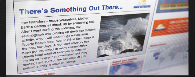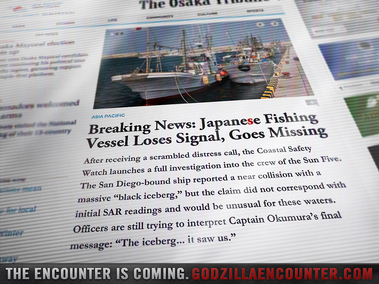 Encounter “Godzilla” When It Makes Landfall In San Diego! Caleb Hamilton, July 10, 2013July 14, 2013 Some strange events have been occurring in Japan over the past few hours. A Japanese fishing boat, heading for San Diego, went missing after hitting what is described as a “black iceberg.” A member of the Citizen Weather Watch has reported “deep sea seismic activity” sending giant waves from Tsujido Beach in Japan all the way to Pacific Beach in San Diego. What does this all mean? Godzilla is coming. Get more details after the jump!Earlier this week, photos of a warehouse in Downtown San Diego surfaced on Twitter, showing damage done by…something, as well as the Legendary Pictures logo. It is known that Warner Bros. and Legendary Pictures will be showcasing Godzilla during their panel in Hall H this year, but could there be an event outside the Con as well? El Mayimbe thinks so, tweeting: “I’m hearing at Legendary #godzilla event on Wednesday they will showcase Godzilla coming out of the ocean!” Today, a Tumblr titled “Godzilla Encounter” appeared, and posted two screen shots of news reports, one from The Osaka Tribune and the other from the Citizen Weather Watch (see below). You may also sign up for updates from Legendary on the page.If you notice, in each picture, one letter is highlighted red. Could it be a code? We’ll keep our eyes on this in the remaining days leading up to Comic-Con, so be sure to check back for updates!Godzilla hits theaters May 16th, 2014! ARGs & Campaigns Comic-Con Conventions Events Social Networks Viral Marketing Comic-ConGodzillaLegendary PicturesWarner Bros