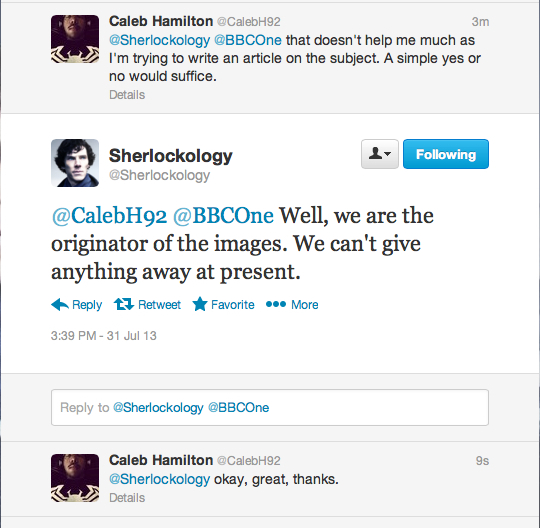 Sherlockology Counts Down To A Big, Dangerous, and Fun “Sherlock” Reveal Saturday Caleb Hamilton, August 1, 2013August 1, 2013 The BBC’s hit series Sherlock returns for its third series this Fall in the U.K. (early 2014 here in the U.S.), and fans on both sides of the Pond have been clamoring for any bit of information following the climax of the second series finale which saw the “death” of Sherlock (Benedict Cumberbatch). Fan site Sherlockology began posting images to various social networks on Monday, teasing “Something Big’s Coming.” See some of the images and get more information after the jump!On Monday morning, Sherlockology posted an image with the words “Something Big’s Coming”superimposed over an opaque number 5 and the hashtag #SherlockR3vealed to their accounts on Facebook, Tumblr and Twitter. And for the past 3 days, they’ve continued to post subsequent images all with a phrase or line of dialogue from Sherlock, a number and the hashtag.As for what this countdown will lead to, it could be a teaser for the upcoming series or something as minute as a clue to what one of the episodes will be about. It was revealed on Monday that Sherlock would face a new nemesis, Charles Augustus Magnussen played by Lars Mikkelsen, brother of Hannibal star, Mads Mikkelsen.In order to find out if this countdown came from an official source or if it was created by Sherlockology, we googled to see if other sources had written stories about it. Nothing came up. We then reached out to Sherlockology directly via Twitter and Tumblr, as they were the source of the images. It took several attempts to get an answer out of them and when we did, they were quite coy.It is not known if the site read the message that was sent to them via Tumblr, however it was pointed out that the information being sought out was explicitly for this article. Never once was Sherlockology asked to divulge whatever will be revealed on Saturday, but it seems they assumed that that was the information we were after. Either way, we’ll know what this is all about soon enough.Sherlock returns to BBC One this Fall and U.S. fans should expect the series to bow on PBS next Spring. Fan Made Work Viral Marketing Sherlock