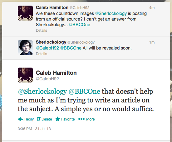 In order to find out if this countdown came from an official source or if it was created by Sherlockology, we googled to see if other sources had written stories about it. Nothing came up. We then reached out to Sherlockology directly via Twitter and Tumblr, as they were the source of the images. It took several attempts to get an answer out of them and when we did, they were quite coy.