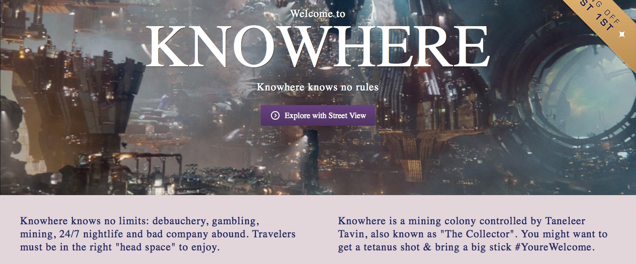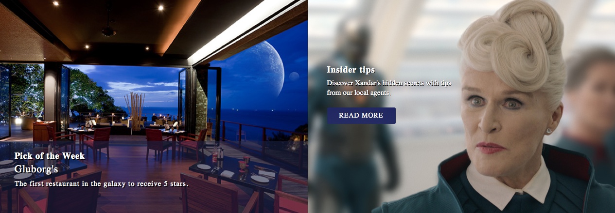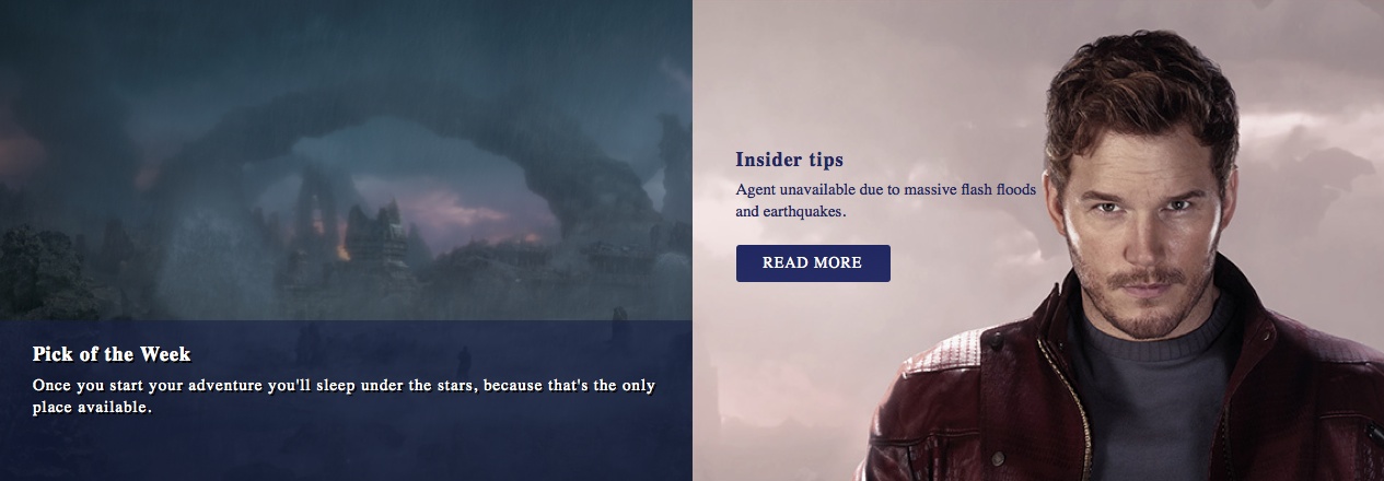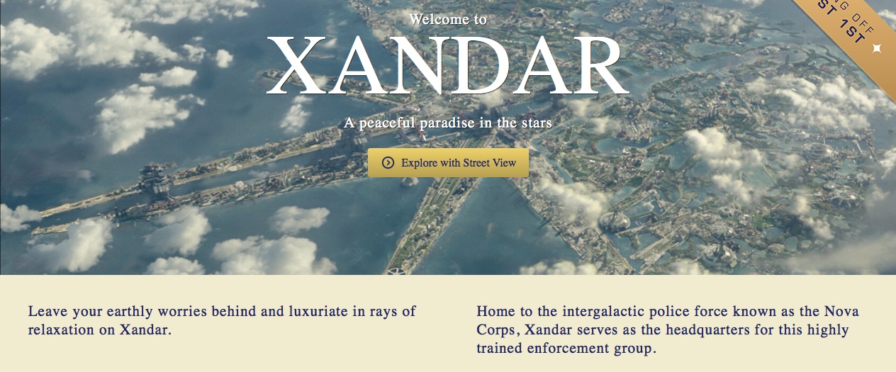 New “Guardians Of The Galaxy” Viral Site Mocks Earth’s Most Beautiful Destinations Michael Lee, July 3, 2014July 3, 2014 The newly launched Guardians of the Galaxy viral site isn’t afraid to tell some of Earth’s most beautiful destinations look like a piece of s***, when compared to some of the locations seen in the film. Marvel recently launched TheGalaxyGetawys.com, a viral site to help promote the release of James Gunn‘s Guardians of the Galaxy. The site acts like a travel agency which helps the user book flights – or space flights – to some of the destinations seen in the film. Hit the jump to see some images, plus a video that contains some new footage.As you may have seen, the new viral video doesn’t contain any action footage, which makes sense considering the tone of the site. But we do get to see some of the amazing set pieces that will be used in the film.Now the site itself contains all sorts of goodies that should keep you preoccupied until the film is released on August 1st, or at least until the soundtrack comes out.There’s Xandar, which is described as a peaceful paradise under the stars. On the page we learn that this planet is home to the Nova Corps, the intergalactic police force that keeps the universe in check. Or the uninhabitable Moarg, the site where Star Lord (Chris Pratt) takes the orb from the ruins. Then of course there is Knowhere. Now this site is of great importance considering it is where The Collector (Benicio Del Toro) holds his collection of rare finds. We got a glimpse of that area in Thor: The Dark World.The site has hilarious confessionals like a human telling us that he got to see three romantic sunsets all at one, alone. Goofy reviews like Earth to Eternity telling us that GalaxyGetaways is the only way to travel to other planets. The site also has games, and a quiz that tells you which member of the Guardians of the Galaxy you are most like.Check out some of the images from the site below. From Marvel, the studio that brought you the global blockbuster franchises of Iron Man, Thor, Captain America and The Avengers, comes a new team—the Guardians of the Galaxy. An action-packed, epic space adventure, Marvel’s “Guardians of the Galaxy” expands the Marvel Cinematic Universe into the cosmos, where brash adventurer Peter Quill finds himself the object of an unrelenting bounty hunt after stealing a mysterious orb coveted by Ronan, a powerful villain with ambitions that threaten the entire universe. To evade the ever-persistent Ronan, Quill is forced into an uneasy truce with a quartet of disparate misfits—Rocket, a gun-toting raccoon, Groot, a tree-like humanoid, the deadly and enigmatic Gamora and the revenge-driven Drax the Destroyer. But when Quill discovers the true power of the orb and the menace it poses to the cosmos, he must do his best to rally his ragtag rivals for a last, desperate stand—with the galaxy’s fate in the balance. Viral Marketing Guardians of the Galaxy
