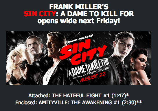 Quentin Tarantino’s “The Hateful Eight” Trailer Will Debut With “Sin City 2”; Will Not Be Available Online Michael Lee, August 14, 2014August 14, 2014 Trailers are an excellent way to market a film, and we have seen in the past, almost everyone will do anything to see a trailer for a film – even stand in a SDCC line to try out the new Galaxy S Tablet just to see Hunger Games Mockingjay Part I teaser. While many studios have tried out many different strategies when it comes to trailer releases, few have made them “not available” online. Though filming had just begun, WB recently decided that the Batman V Superman: Dawn of Justice teaser shown at SDCC would never been shown again.So imagine what it would be like for Quentin Tarantino to show a teaser for The Hateful Eight in front of Sin City: A Dame To Kill For. The filmmaker hasn’t even shot anything yet, and there is already a teaser. We do have a poster though. But that’s not the only thing. It has been confirmed that not only will there be a teaser for The Hateful Eight, but it won’t shown online. Meaning you have to buy a ticket for Robert Rodriguez’s Sin City: A Dame To Kill For, just to see a teaser.Like I said, there will be people who are willing enough to buy a ticket at the price they are at now just to see a teaser. For more, hit the jump./Film reports that Alberta Film Ratings board posted a listing for The Hateful Eight teaser, which says that it will run at 1:40. What is also interesting is that /Film adds that they have contacted multiple theaters who have received info for the trailer that has been enclosed with DCP distribution of Sin City: A Dame to Kill For.The information enclosed included this image:As you may see, the image says that the teaser runs at 1:47, seven seconds longer than what the AFR says it does. Again, filming has yet to begin, so I’m guessing there will be plenty of voice overs complete with signature images and tone setting cinematography. Here’s the synopsis for the film: The Hateful Eight follows the steadily ratcheting tension that develops after a blizzard diverts a stagecoach from its route, and traps a pitiless and mistrustful group which includes a competing pair of bounty hunters, a renegade Confederate soldier, and a female prisoner in a saloon in the middle of nowhere.The early (and somewhat unconfirmed) cast for The Hateful Eight cast includes Bruce Dern, Samuel L. Jackson, Michael Madsen, Walter Goggins, and Kurt Russell.Source: /film News Quentin TarantinoSin City: A Dame To Kill ForThe Eightful EightThe Weinstein Company Robert Rodriguez