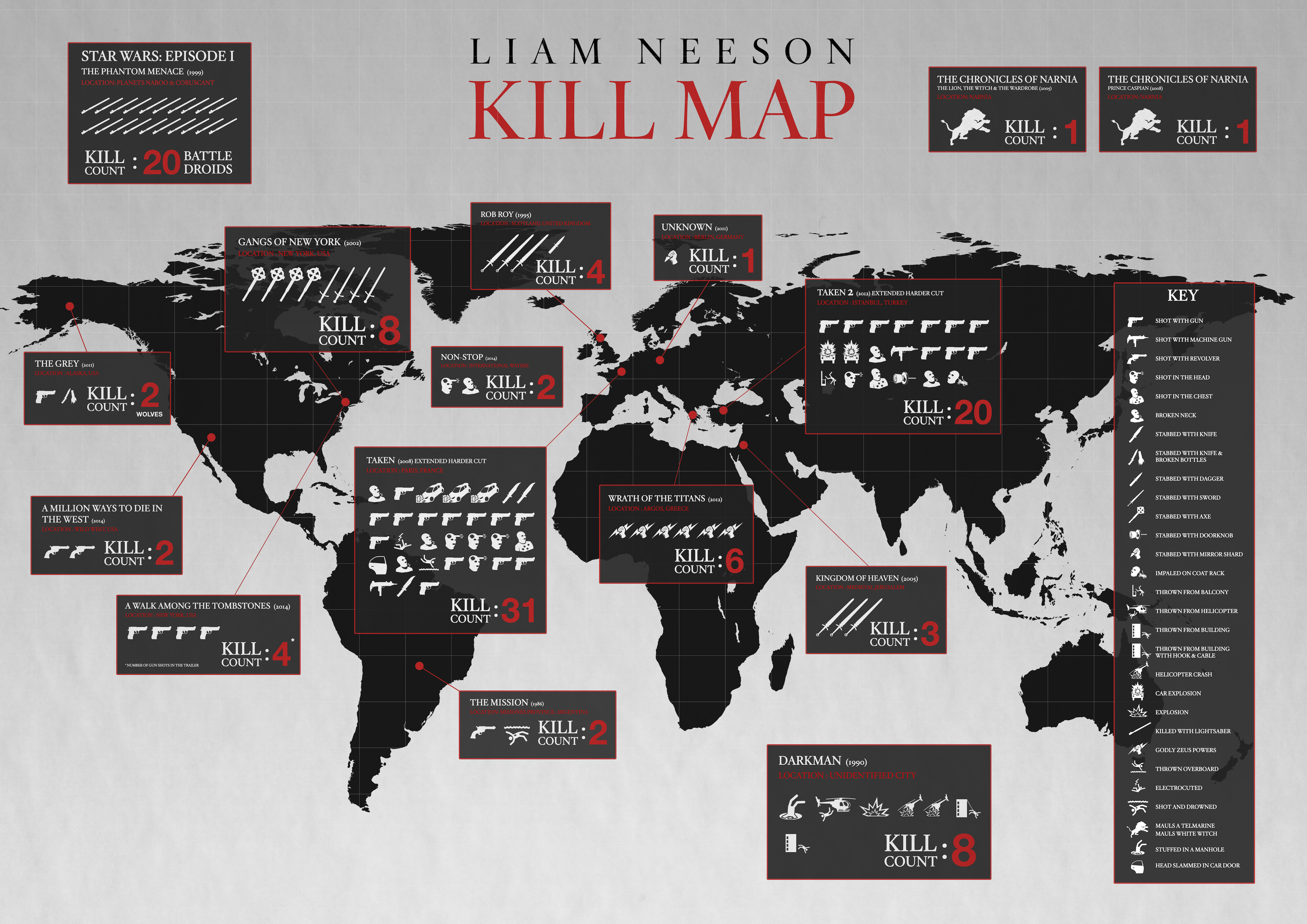 Liam Neeson “Kill Map” Charts Actor’s Kills Across His Movies Michael Lee, September 17, 2014September 17, 2014 Liam Neeson truly has a particular set of skills. He’s been a Jedi, a hitman, a lion, a mythological Greek god, Batman’s teacher, a knight, Jean Valjean, and so much more. But for a man who has many talents, it’s hard to believe that no one has tracked all of his kills throughout his film career. Well today that ends.To help promote his upcoming thriller A Walk Among The Tombstones, Universal Pictures has released a infographic that charts Neeson’s kills in all of the released films he has been in. The chart also makes a note of who he has killed (humans, battle droids, etc), and how he has killed them (lightsabers, guns, swords, barehands, etc). Hit the jump to check it out.A Walk Among The Tombstones Opens this Friday.‘A Walk Among the Tombstones’ stars Liam Neeson as Matt Scudder, an ex-NYPD cop who now works as an unlicensed private investigator operating just outside the law. When Scudder reluctantly agrees to help a heroin trafficker (Dan Stevens) hunt down the men who kidnapped and then brutally murdered his wife, the PI learns that this is not the first time these men have committed this sort of twisted crime.. nor will it be the last. Blurring the lines between right and wrong, Scudder races to track them through the backstreets of New York before they kill again. Viral Marketing Viral News A Walk Among The Tombstones