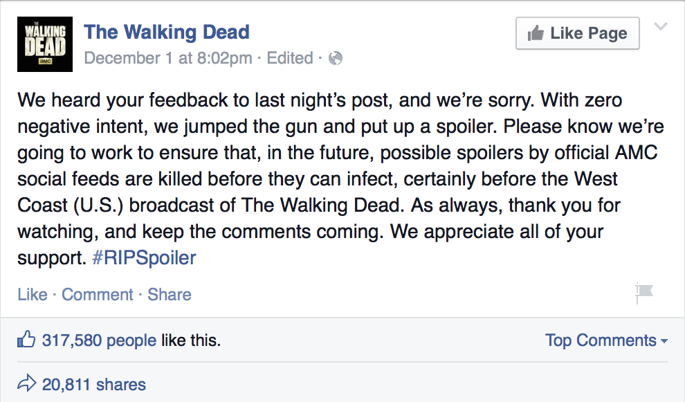 That “The Walking Dead” Spoiler and the Death of Viral Marketing Caleb Hamilton, December 5, 2014February 2, 2025 As soon as the east coast airing of the mid-season finale of AMC’s The Walking Dead ended this past Sunday, the various social media accounts associated with the program posted a huge spoiler to the dismay of millions of fans around the world who had yet to see the episode. This has happened before, but not for The Walking Dead. NBC spoiled the death of Danny Matheson during Revolution. The stars and producers of Marvel’s Agents of S.H.I.E.L.D. live tweet every episode – even the Executive Editorial Director of Marvel’s Digital Media Group, Ryan Penagos, gets in on that action. Is this to build hype or is there something much more sinister and scolding behind this behavior? Could this be the end of viral marketing? Find out after the jump.Since posting the spoiler, the Facebook page of The Walking Dead has issued an apology and vowed to never post a spoiler (early) again. Not just for The Walking Dead social feeds, but for all AMC social media feeds. Why did this happen? How did it happen? We may never know, but we have to give AMC the benefit of the doubt that it was an honest mistake. The east coast had just seen the episode and this picture goes out across Facebook, Twitter and Instagram. Millions of followers and fans are exposed and all AMC can say is “oops.”Isn’t it the responsibility of the social media managers for these programs to make sure that the surprise of their content is protected instead of posting a picture to generate hype that’s already there? The Walking Dead is one of, if not THE, most-watched shows on cable. AMC doesn’t need to generate hype this way – they’ve won everyone over and posting the death of a character sure isn’t going to bring anymore viewers in. But was this really a mistake and if not, was it really to generate more hype for the #1 show on TV?With the advent of “live blogging” official accounts and those directly have begun to find it appropriate to punish the DVR and OnDemand audiences and reward those who watch live. It’s no longer about creating buzz and viral marketing – it’s about dollars and ratings. Early adopters gave them the buzz and now that nearly everyone is on board with these various shows and brands they feel that it is okay to spoil the biggest parts of the episodes because they think everyone is watching live.By doing this, they kill buzz instantly. The Walking Dead thought they were going to create some sort of positive buzz for the episode with their spoiler, but they just ruined it for millions of fans and killed any buzz they hoped to gain.Hulu hurts providers such as Verizon, Comcast, and Time Warner because you don’t need to subscribe to them to enjoy your shows. Just pay $7 a month (for Hulu Plus), watch the commercials and you’re up to date at the water cooler the next morning at the office. Now all of that has changed. Certain programs on Hulu require proof of subscription to a cable provider, much like HBO GO – even if you pay for Hulu Plus. It tends to be the more popular programs on ABC and NBC, like Scandal or The Blacklist. The cable providers probably signed a deal with the networks and pressured Hulu into to making the highly-rated content unavailable without paying for a monthly cable subscription. Hulu claims this policy is to give you “faster” access to content, but you still have to wait until the next day just like everyone else. What used to be a voluntary action is now mandatory. It is not fair.Personally, I have had these thoughts for a while. You start to notice little things here and there. Announcers urging you to watch live at the end of promos for next week’s episode. Little hashtags show up during the program, #watchlive. You can no longer fast forward through many OnDemand titles. The Marvel people started live blogging Agents of S.H.I.E.L.D., posting spoilers on Twitter and new this season, posting spoilery gifs on Tumblr. This kind of backwards, malicious “viral marketing” is going to hurt the networks in the long run. TV networks are not the only culprits in the downfall of viral marketing though.At MovieViral we thrive on viral campaigns. We’ve watched the rise and fall of viral over these last few years. It all started with Cloverfield and 10.18.08. Studios hired marketing firms like 42 Entertainment to create elaborate online and real world Alternate Reality Games (ARG) to bring audiences into the world of the movie. These were huge projects: from Why So Serious for The Dark Knight to Flynn Lives for TRON: Legacy. Even food processing companies employed the use of viral. Wrigley’s 5 Gum ran an extensive campaign that encouraged humans to tap into their hidden potential in Mission Icefly. Now studios are opting to do their own viral campaigns in house.Most recently, Universal launched a campaign for Jurassic World. They shot themselves in the foot by posting that the teaser trailer would debut on Thanksgiving even though the countdown they created still ran. Then they debuted the trailer two days early. The countdown ended on Thanksgiving night and was replaced by the trailer. By then, everyone had seen the footage and didn’t care about the viral campaign or the trailer. The millions of people watching the football game on NBC saw it on TV. There wasn’t any need to visit a viral site and take part in a campaign. This may have been done to avoid being crushed by the Star Wars: The Force Awakens trailer, but that’s a whole separate issue.Movie studios and TV networks are killing what was once an innovative and exciting new way of engaging audiences and letting them be a part of the entertainment experience instead of being just consumers. They were rewarded with props and posters. Bragging rights. They even got a bit of exercise when they participated in scavenger hunts at Comic-Con or one of the cities chosen to host a dea