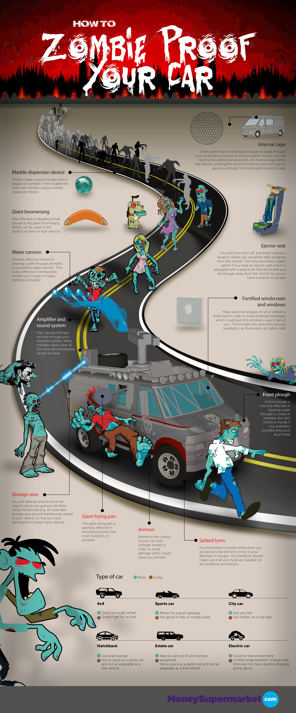 Zombie-Proof Your Car and Home! Dan Koelsch, October 24, 2012September 21, 2013 Back in June, we reported that Robert Kirkman, creator and writer of The Walking Dead comics, had designed a Zombie-Proof Car for Comic-Con. However, that was a promotion with Hyundai, so I’m sure there were some limitations in place. If you’re prepping for the zombie apocalypse in December, never fear, because MoneySuperMarket.com has created infographics on how to really zombie-proof not only your car, but also your home. Study up after the break. Viral Marketing infographicZombies